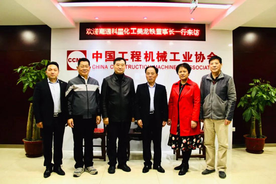 2020年11月12日南通科星化工有限公司董事長吳龍鐵(右三)、原山東重工集團總經理助理高級顧問顏開榮(左二)、南通科星化工有限公司總經理傅士超造訪中國工程機械協會,中國工程機械協會常務副會長兼秘書長蘇子孟(左三)和中國工程機械工業協會副秘書長尹曉荔(右二)親切接待