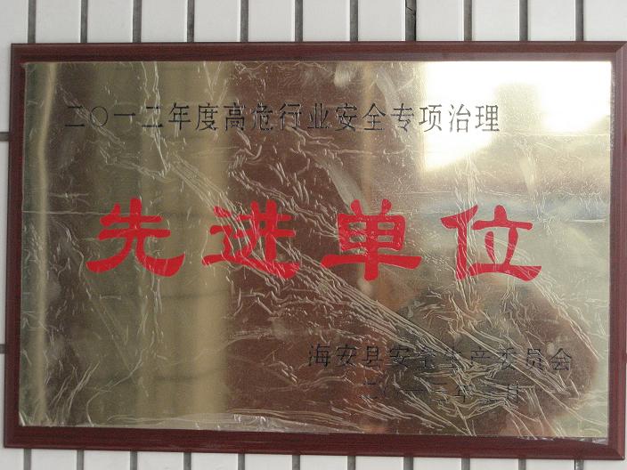 我公司被海安縣安全生產(chǎn)委員會評為《二0一二年度高危行業(yè)安全專項治理先進(jìn)單位》。